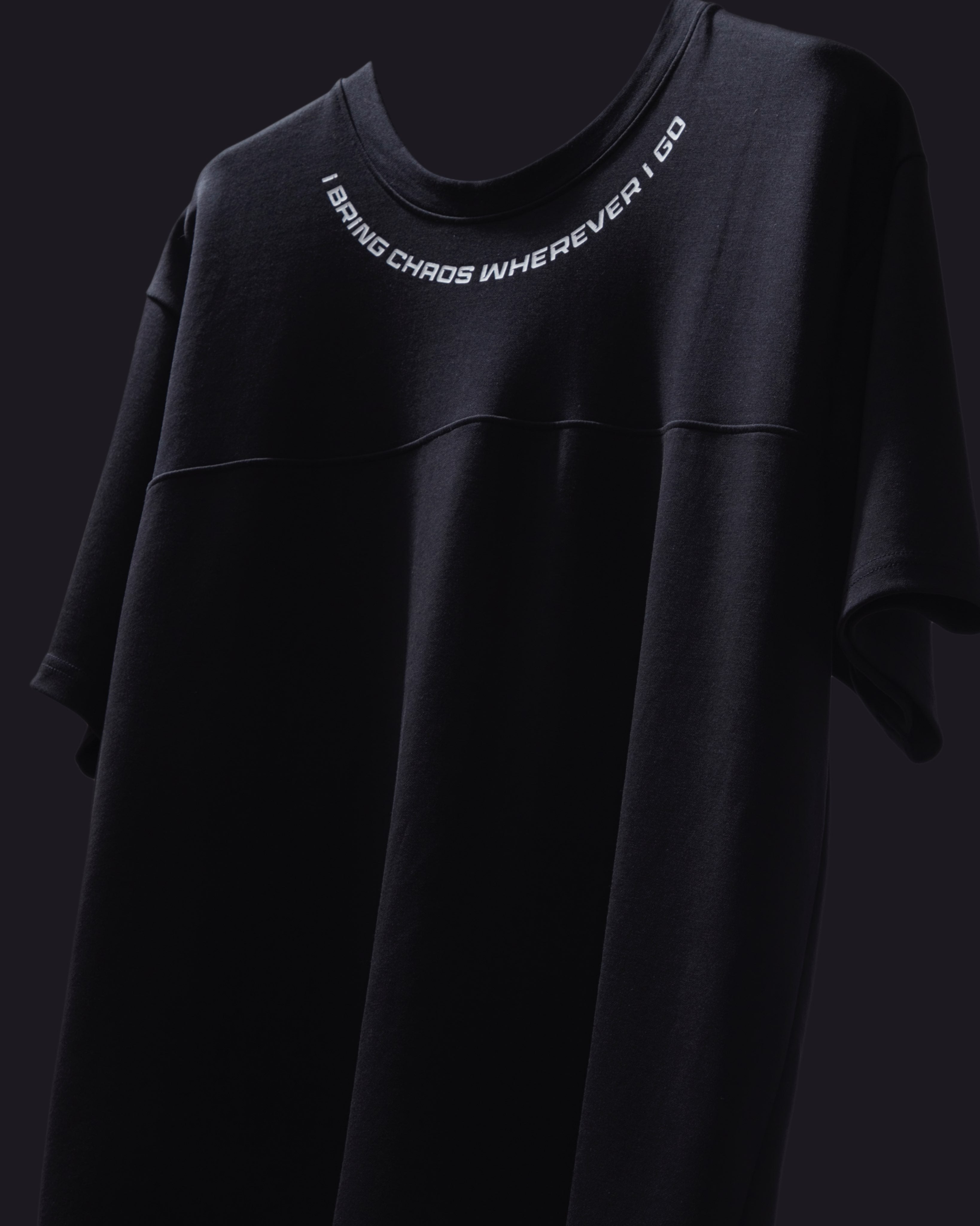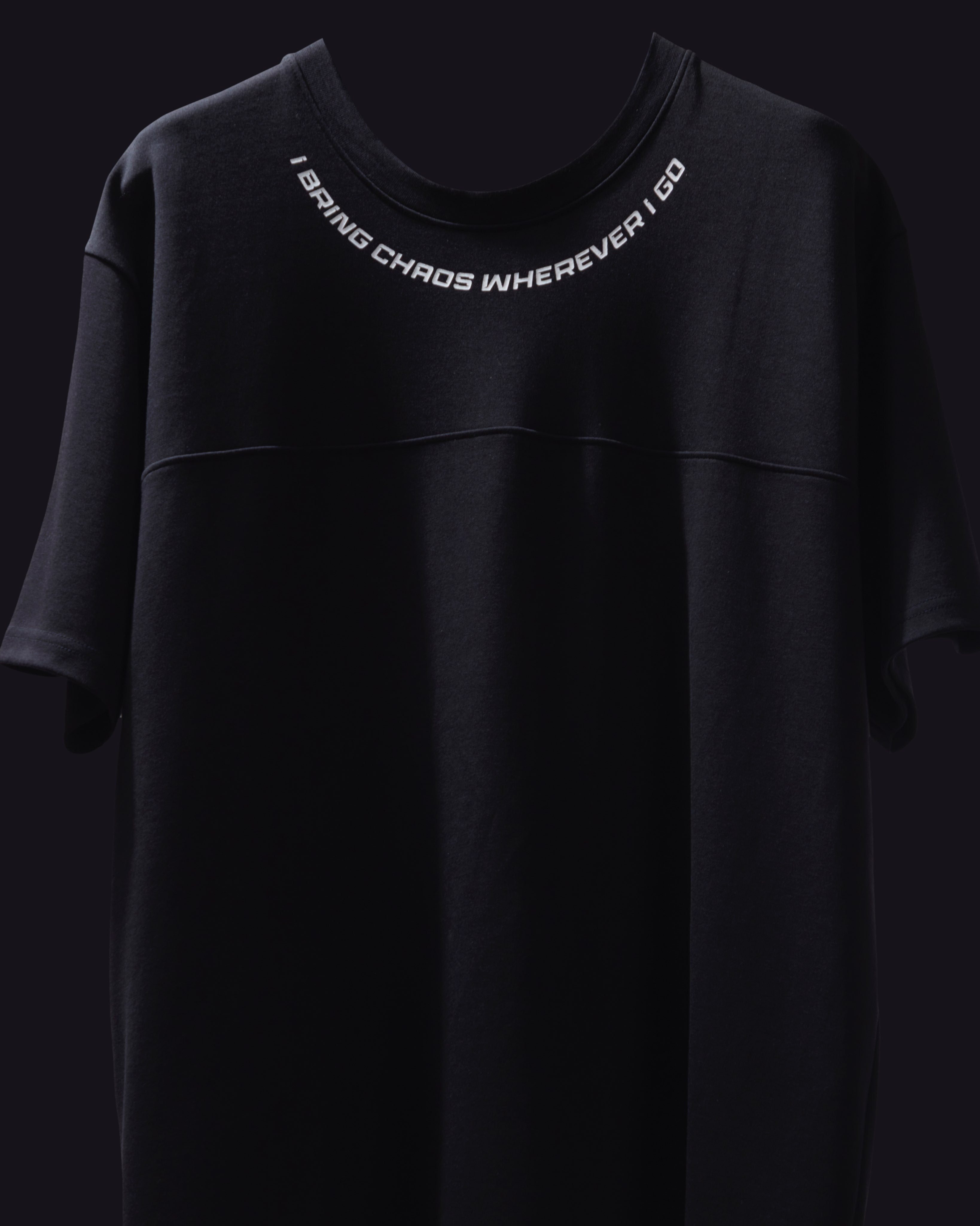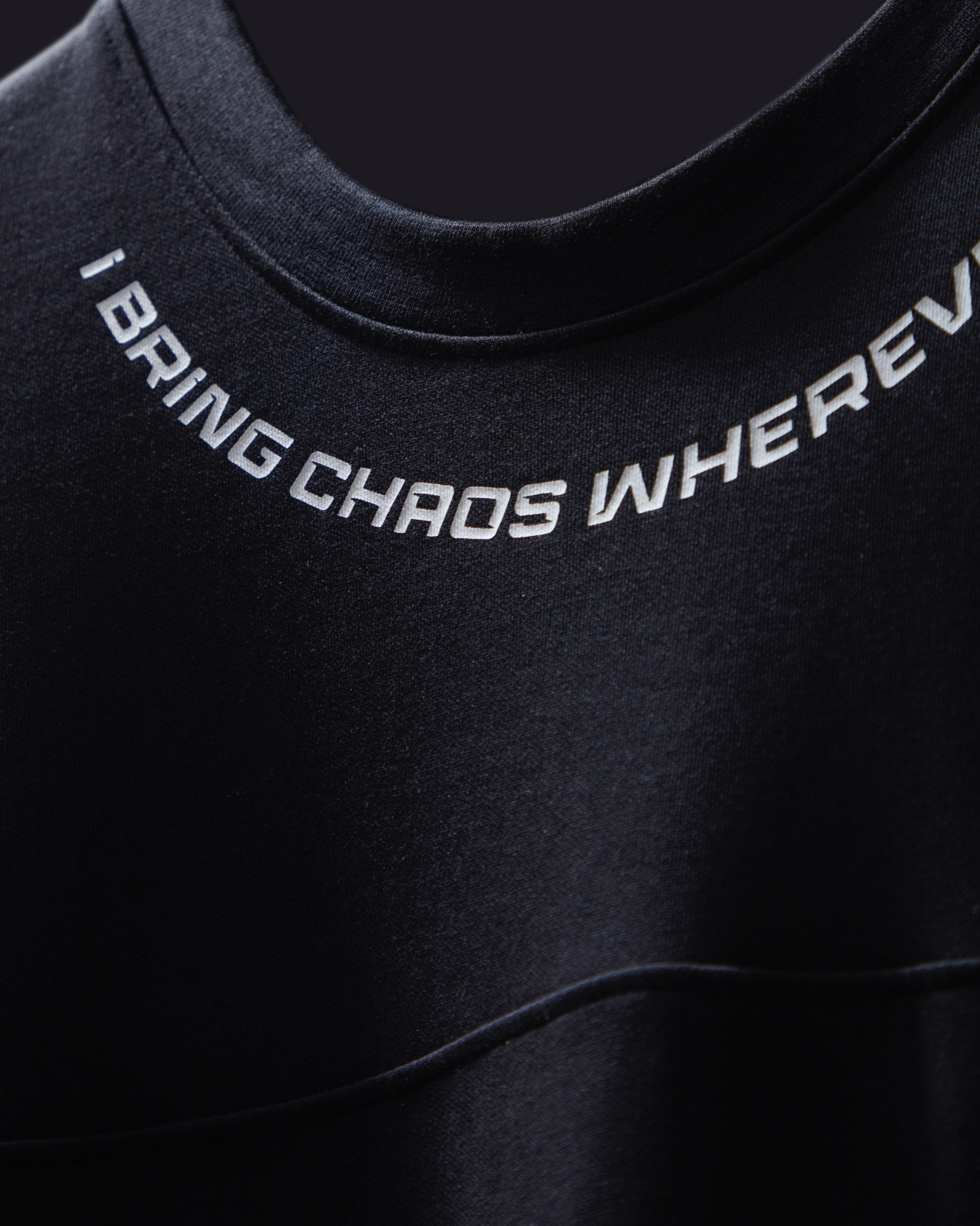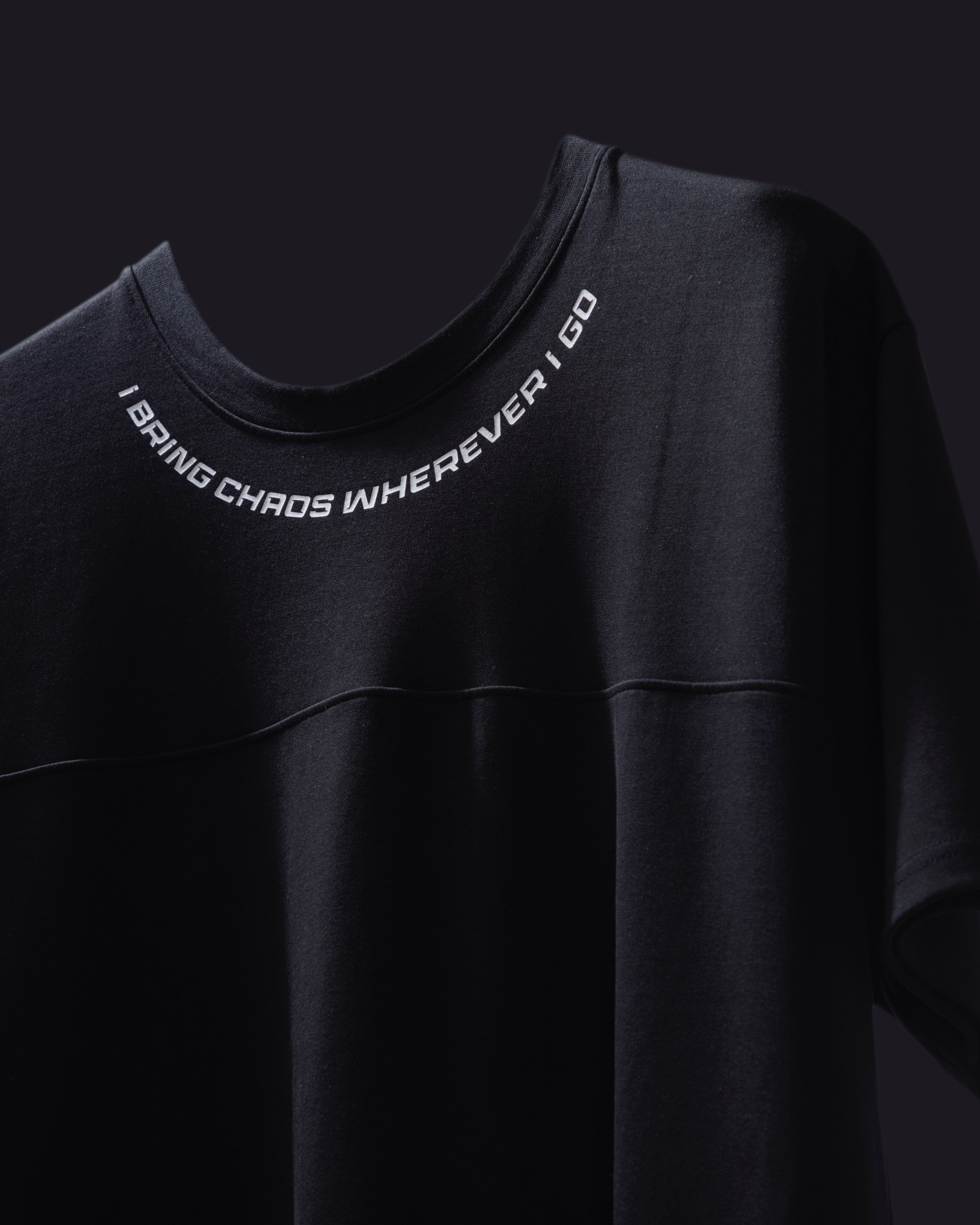 We placed the statement "I BRING CHAOS WHEREVER I GO" on the neckline, the most disruptive, personal space on a garment. It rests where your identity begins. It’s a mantra for you, not a billboard for them. It’s an internal truth worn externally to keep the flames of rebellion alive!